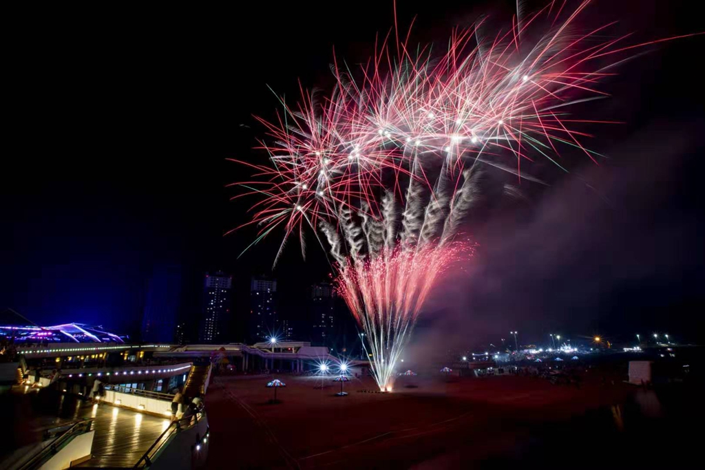 晚8點(diǎn)整,隨著突如其來的炸響,煙花秀開始了,一團(tuán)團(tuán)彩色的光芒快速上升,“啪”,一朵“花兒”在空中綻放!沿著海灘一齊點(diǎn)燃,幻化出一道道海上的彩虹,如詩如幻、剎那芳華,炫美煙花照亮了“金潮”的未來!孔雀開屏,真的像孔雀開了屏一樣,形狀呈扇形,絢麗奪目;搖錢樹,火樹銀花搖曳多姿,隨著聲響,金色的,銀色的,如雨般落下;還有錦上添花,繁花似錦,萬事順,步步升,好運(yùn)來,都是吉利的名字。升入空中的煙花,將夜晚黑峻峻的海面映得五彩斑斕,流光溢彩。煙花如流星雨般落入海面、沙灘,說不盡的浪漫和美麗。那些煙霧繚繞著,如夢(mèng)似幻,分裂成無數(shù)小小的光點(diǎn),被海風(fēng)一吹,很快就散開了。煙花與音樂交相輝映,美輪美奐,定格在了金脈廣場(chǎng)上空。