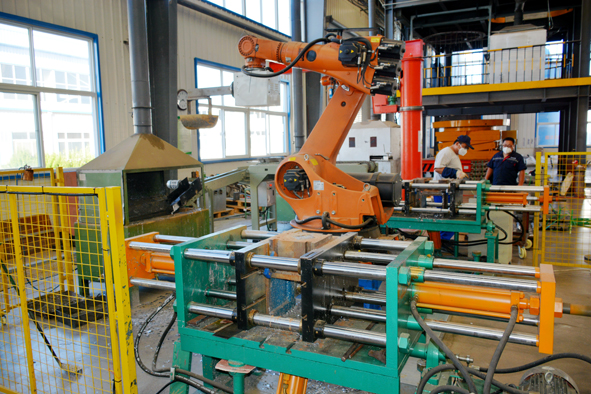 2017年,金潮宇科蓄電池公司核電生產(chǎn)啟用自動澆鑄機(jī)器人、自動焊接機(jī)器人,利用機(jī)器人自動化生產(chǎn)技術(shù)改造升級,滿足多個類型的產(chǎn)品生產(chǎn),從而縮短了生產(chǎn)周期,生產(chǎn)率提高了20%-30%,高效而有力地推動了企業(yè)由“制造”向“智造”的轉(zhuǎn)型升級。